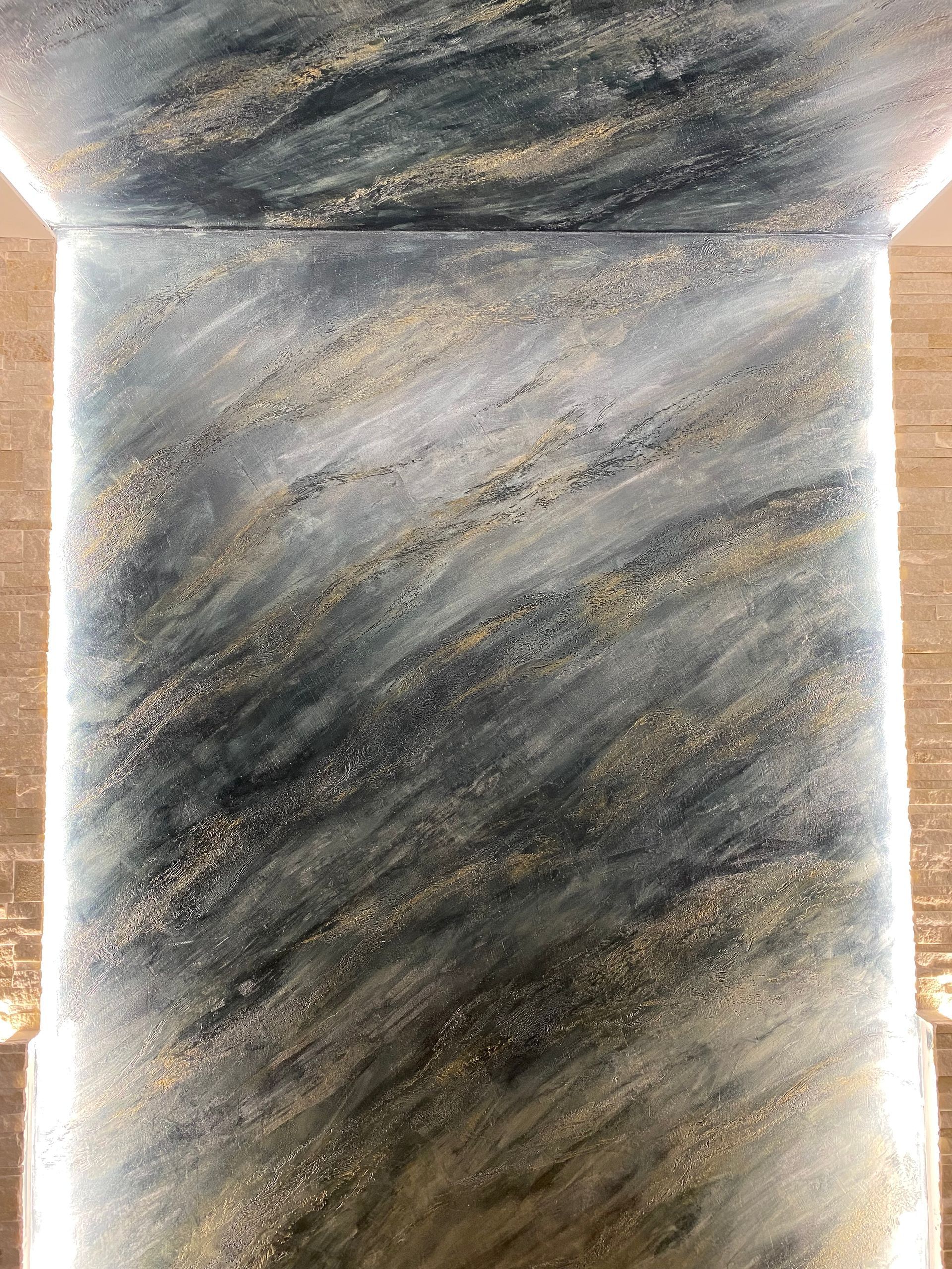 Gli effetti decorativi murari, applicati sulle superfici, imprigionano preziosi frammenti metallici forgiati nella pittura che li incorpora, esaltando gli effetti dorati, argentati e ossidati.